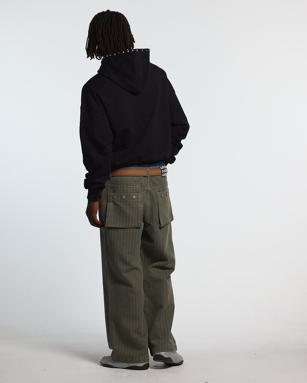 Tachuelas metálicas decorativas alrededor de la capucha y en el bolsillo canguro.