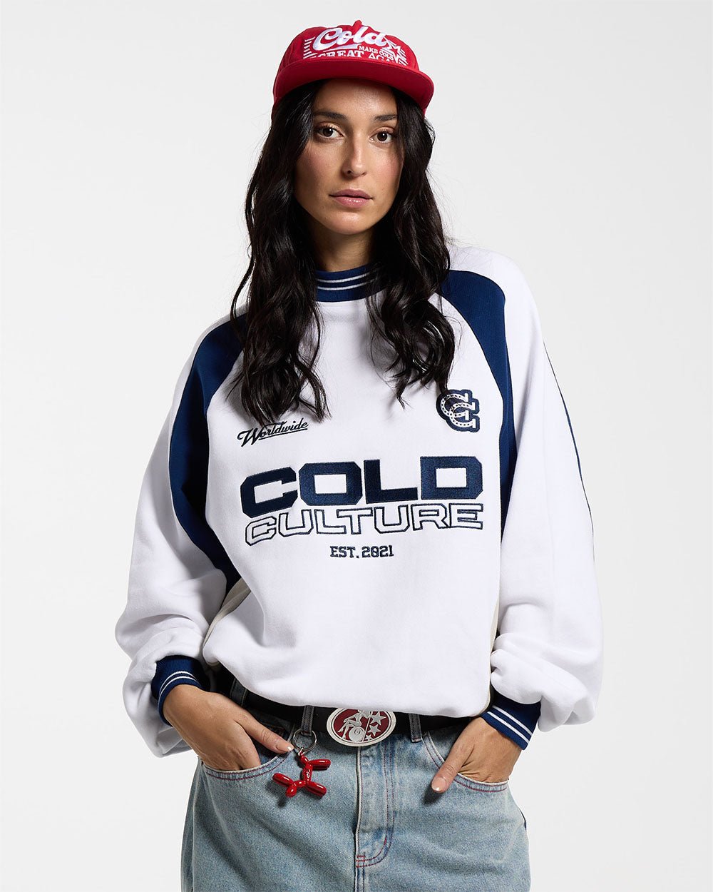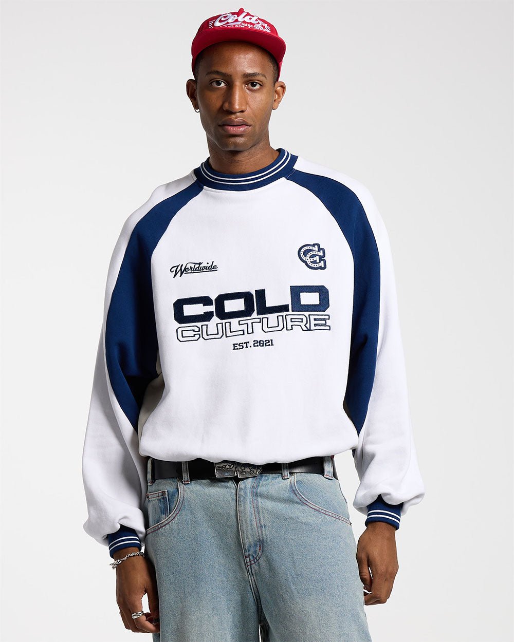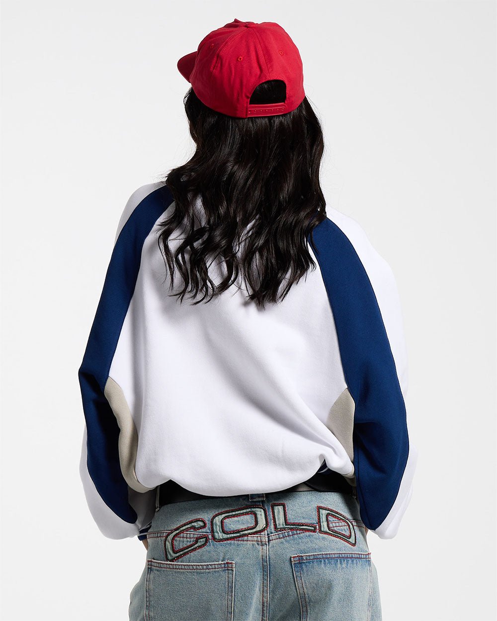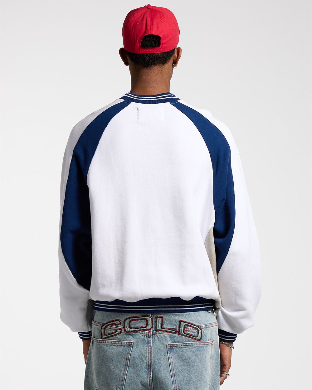 CAMISETA VAQUERA UNIVERSITARIA DE CUELLO REDONDO BLANCA/AZUL