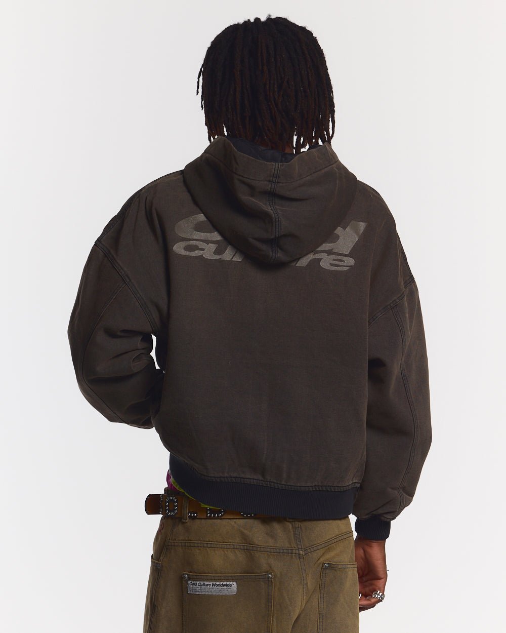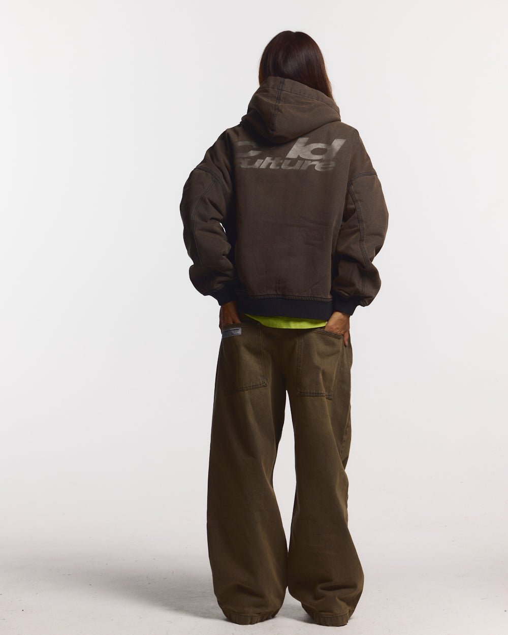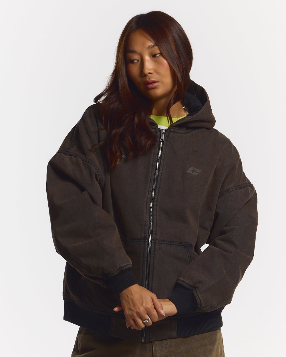 Chaqueta con capucha, corte cuadrado y gran tamaño.
