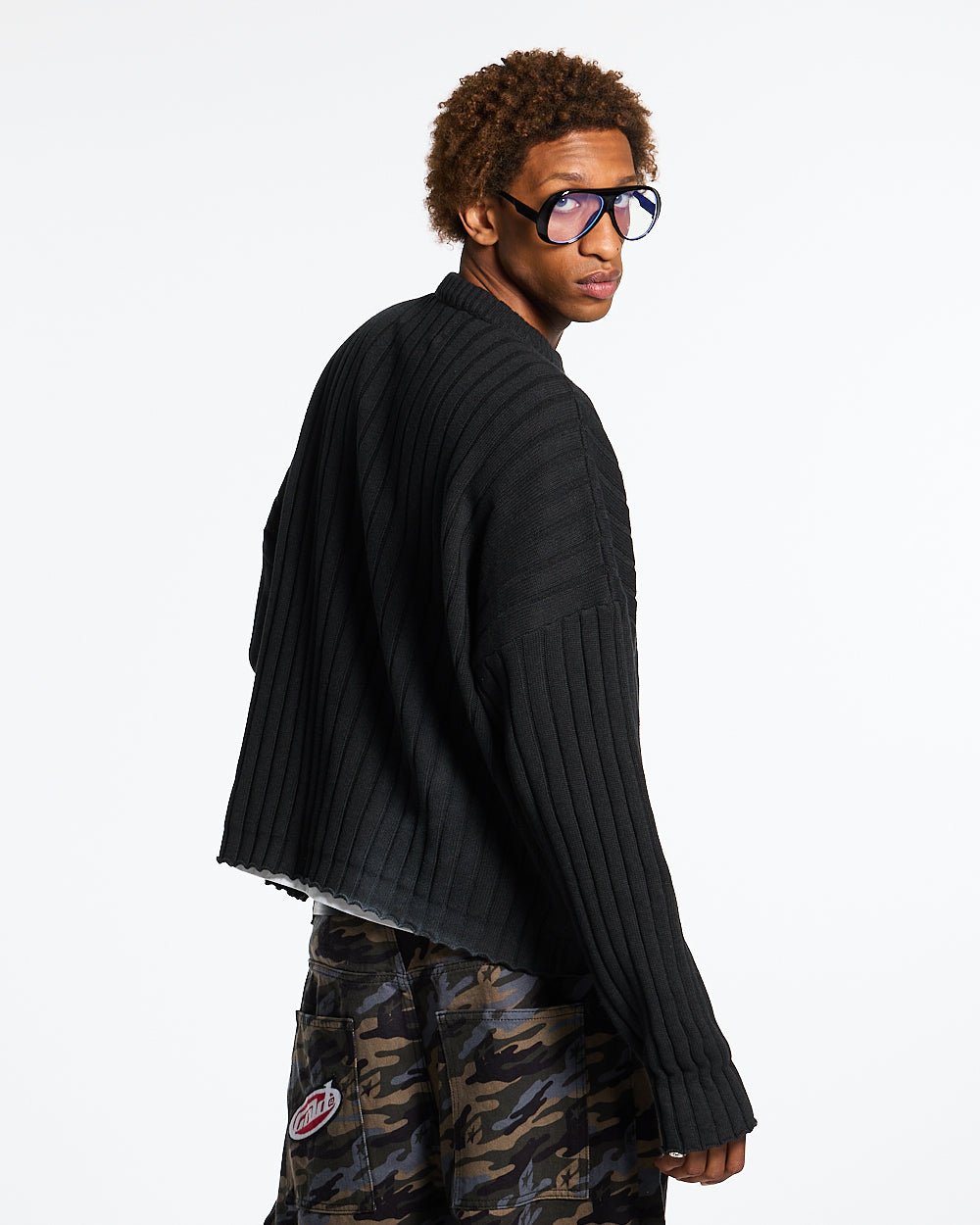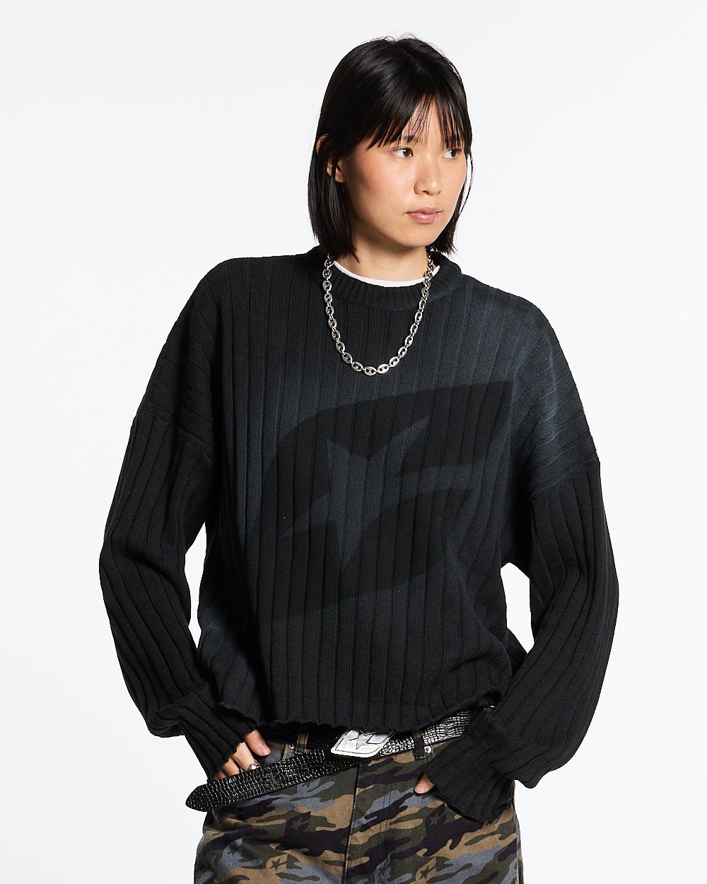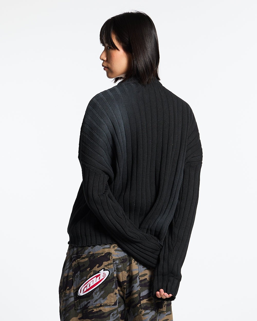 Camisa negra de manga larga curva Distress