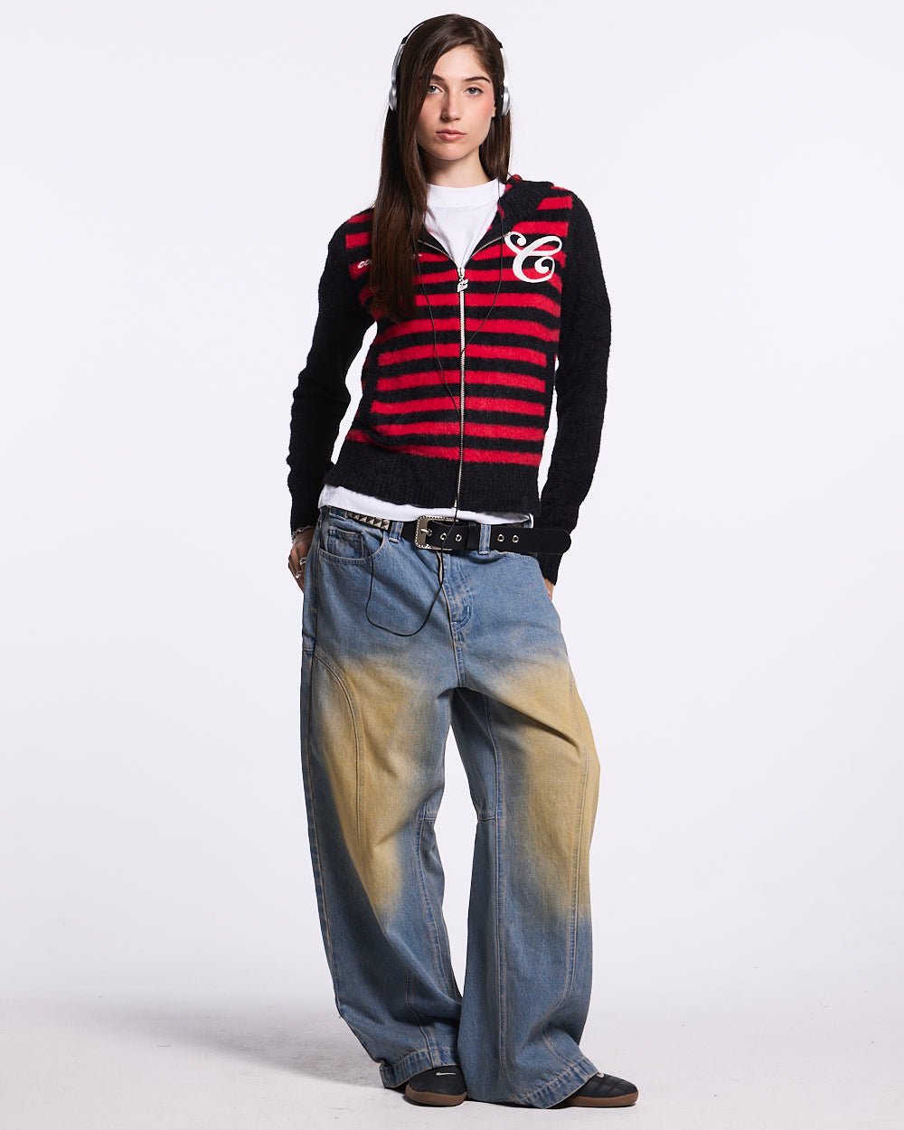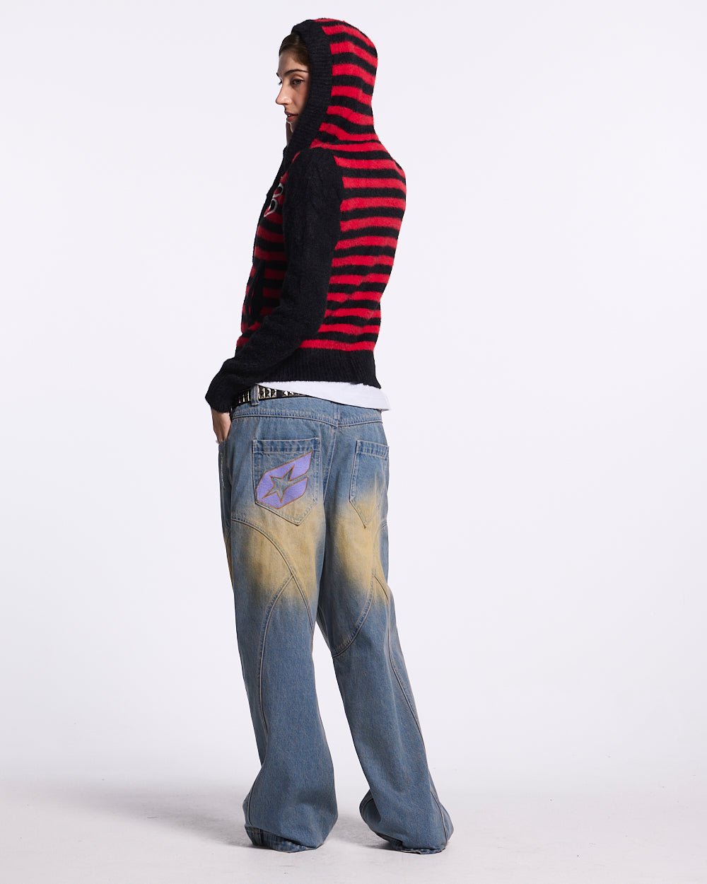 Rayas horizontales rojas y negras en el cuerpo y la capucha.