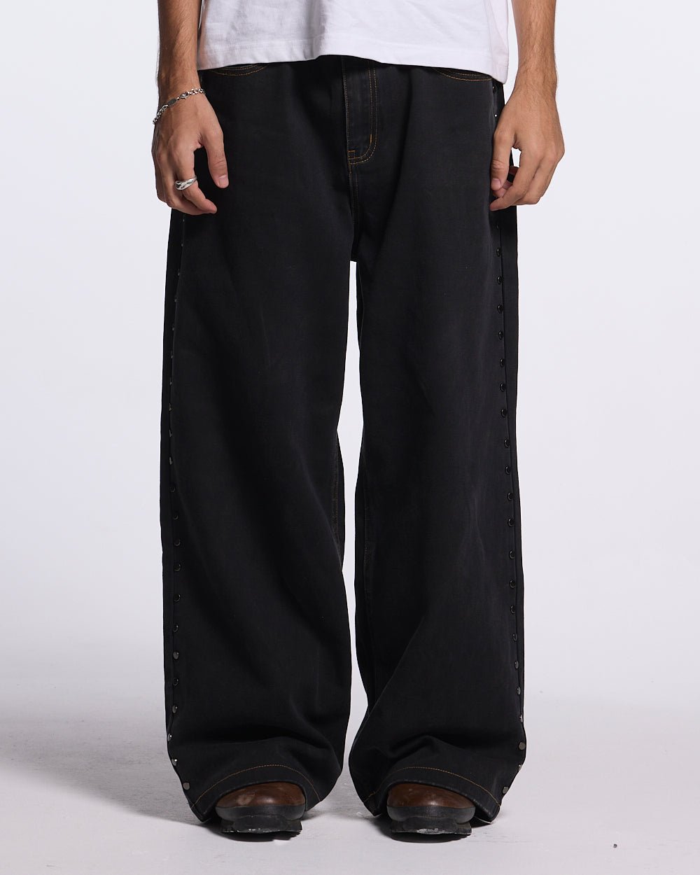 Color negro con tachuelas metálicas a lo largo de las costuras laterales.