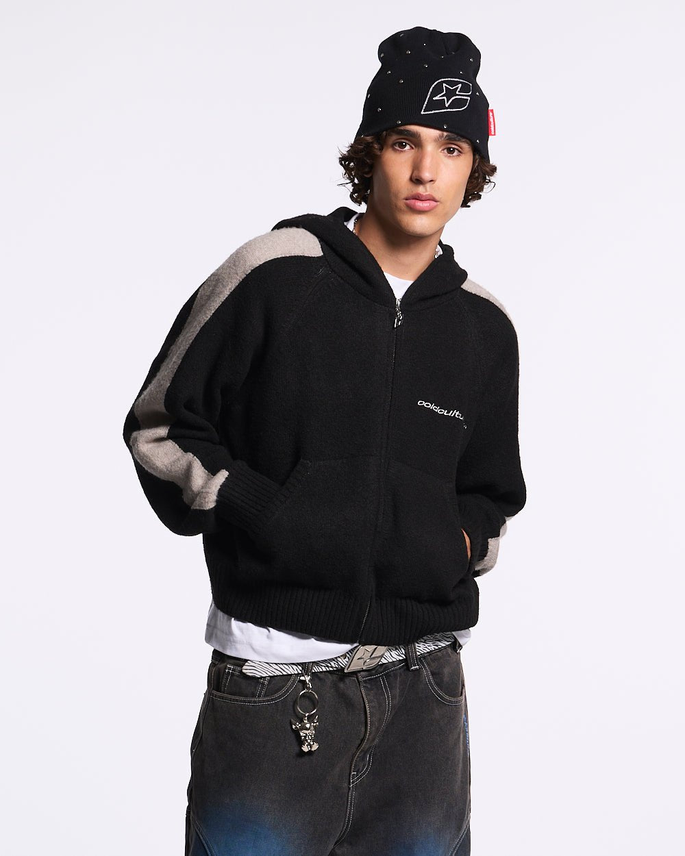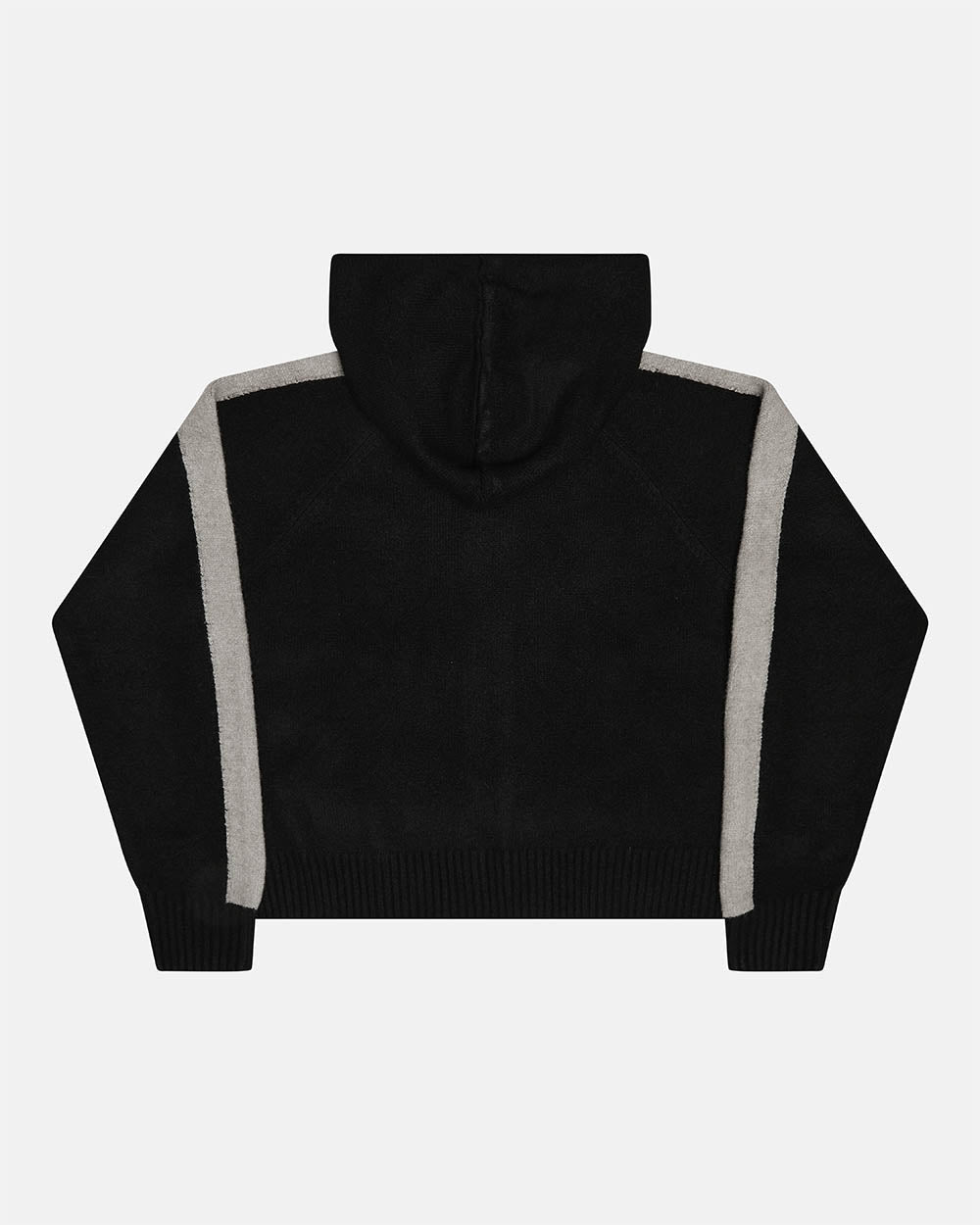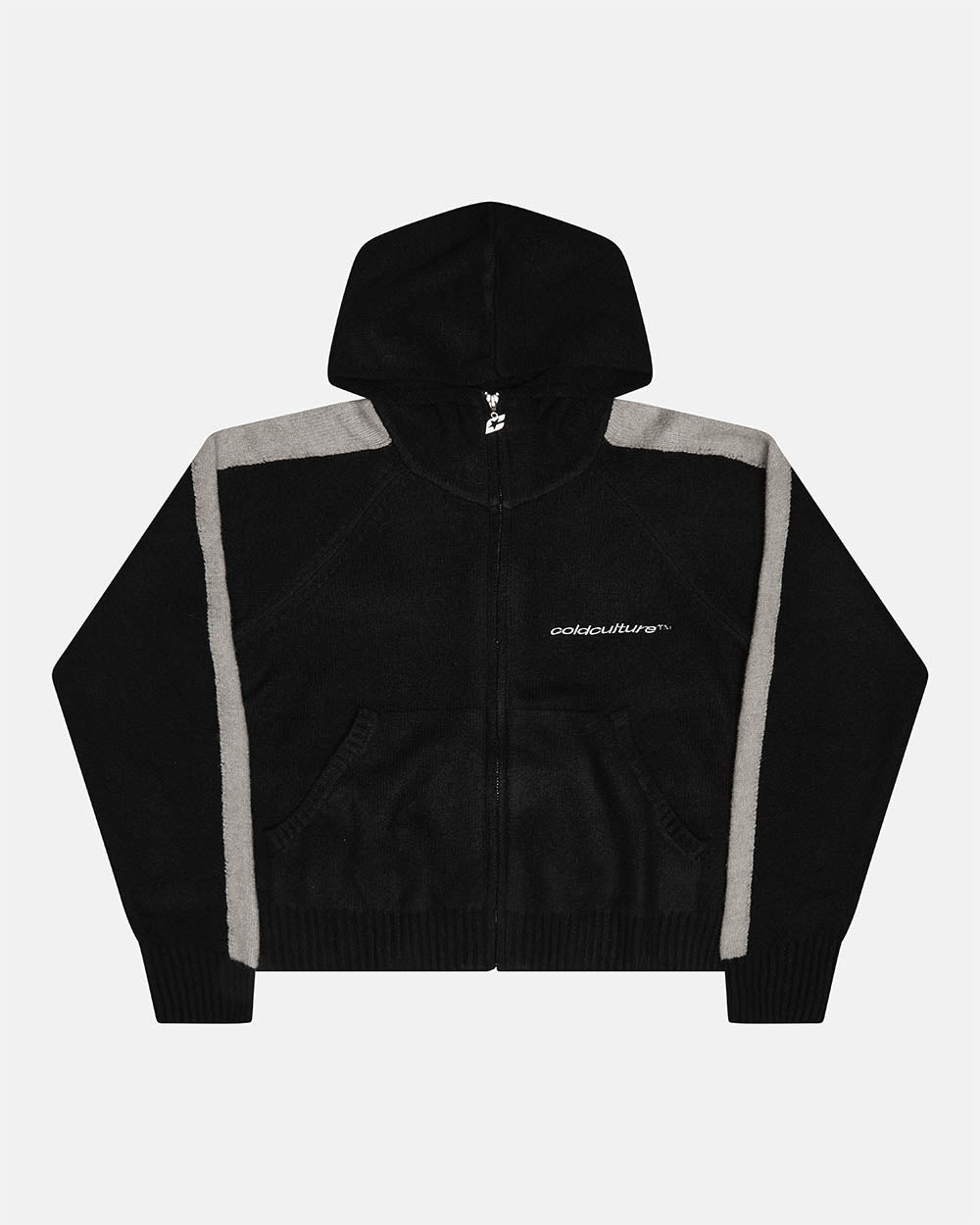 Sudadera con capucha y cremallera completa en tejido de punto negro vibrante.